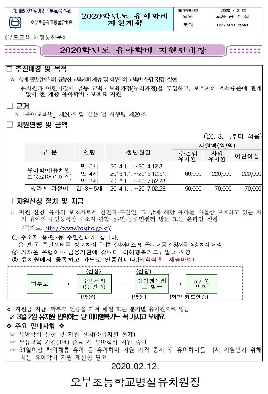 2020학년도 유치원 유아학비 지원 계획을 붙임과 같이 안내드리오니 참고하시어