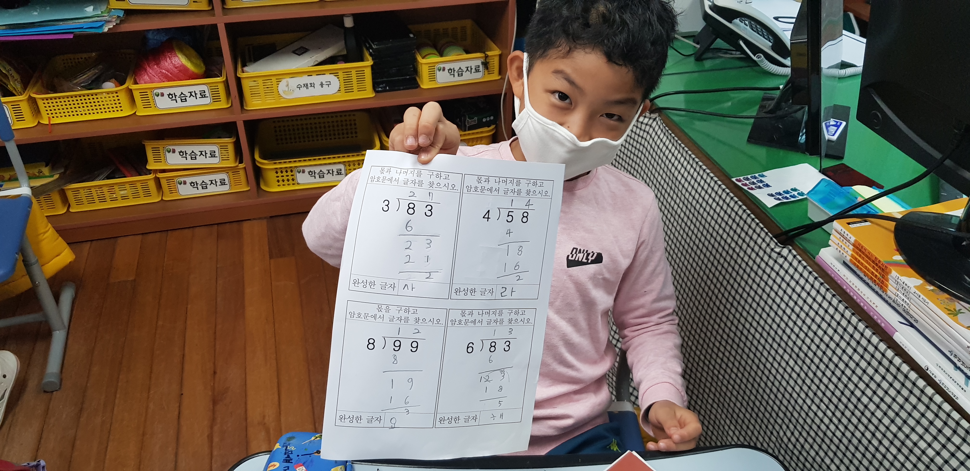 [정리활동]: 암호문 풀기 - 마지막으로 다시 한번 스스로 암호문 학습지를 풀어보며, [사랑해요]라는 암호를 찾고, 나눗셈도 완벽하게 익히게 되었습니다. ^^
