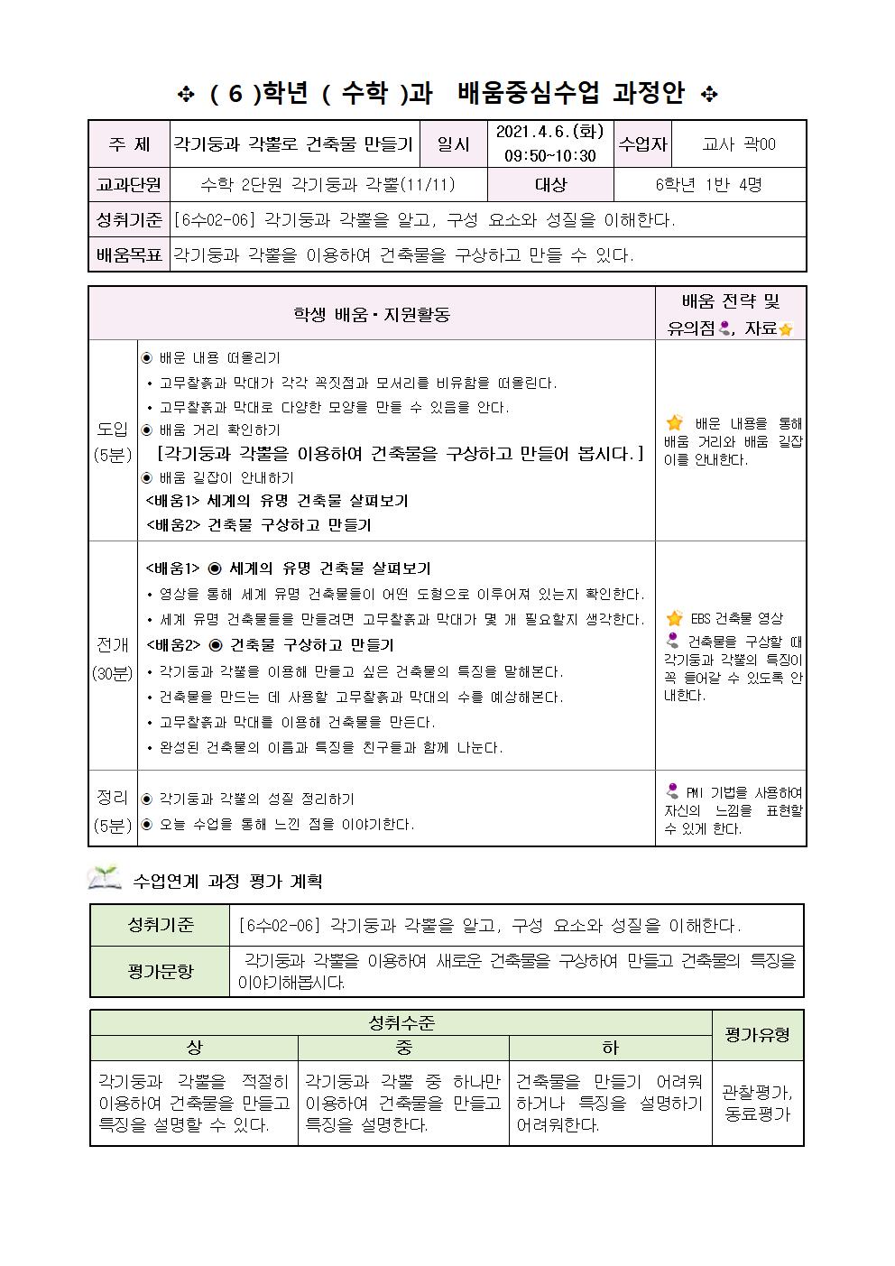 6학년 수학과 수업과정안(2. 각기둥과 각뿔 - 각기둥과 각뿔로 건축물 만들기) 입니다.