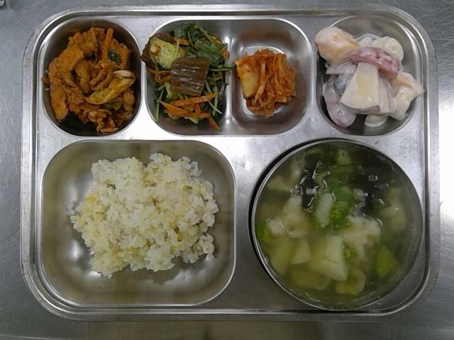 렌틸콩밥 우리밀수제비국(6.18) 과일샐러드(2.12) 도토리묵무침(5.6.13) 돼지고기야채볶음(5.6.10.13) 배추김치(9) * 에너지/단백질/칼슘/철 695.4/31.8/408.1/5.2