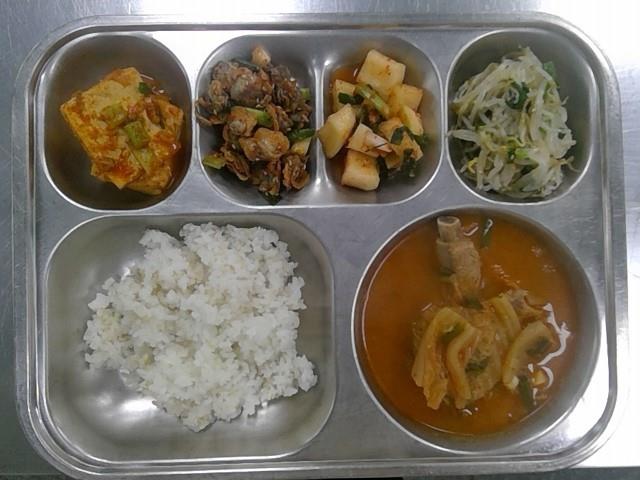 발아현미밥 돼지등갈비김치찌개(5.6.9.10) 두부양념조림(5.6.13) 숙주나물무침 꼬막야채무침(5.6.18) 깍두기(9) * 에너지/단백질/칼슘/철 605.1/27.8/188.2/6.6